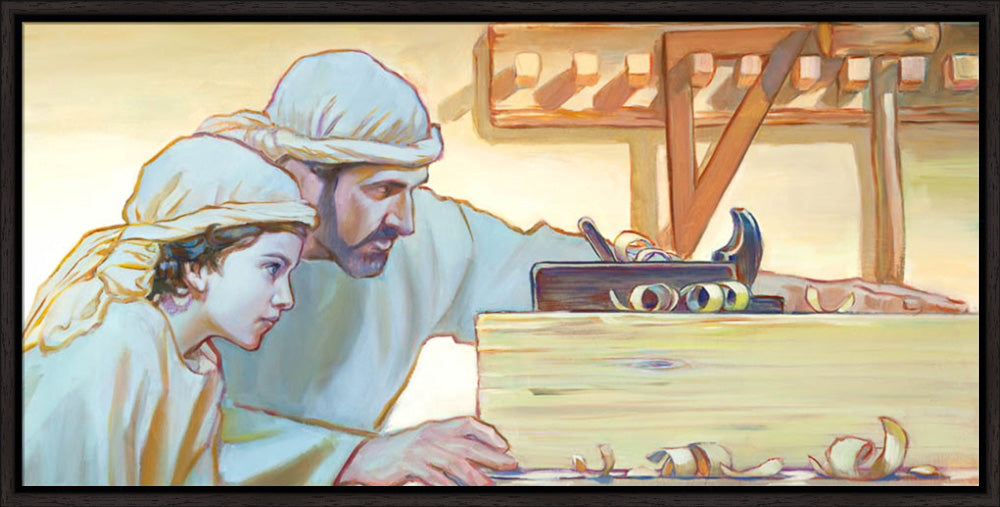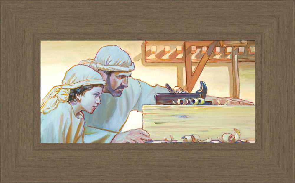 In this piece, Joseph and Jesus are sharing a father-son moment while in the carpentry shop. Jesus is learning the trade of His father. While shaving a plank of wood with a wood plane, both figures are checking for straightness and trueness. True craftsmanship in woodworking demands exactness: angles and measurements must be precise or the pieces will have to be re-cut or corrected. The principle of being straight and true is a metaphor for exactness in keeping the commandments and temple covenants.